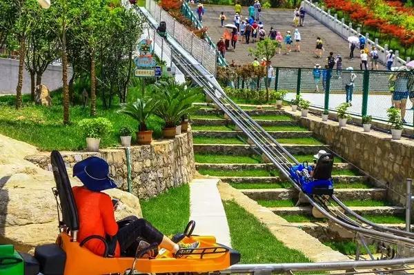 络绎不绝的游客乘着”滑道“从西峰广场到索道检票口。滑道两旁景致别有一番风味,像是去游乐园玩慢版过山车一样。