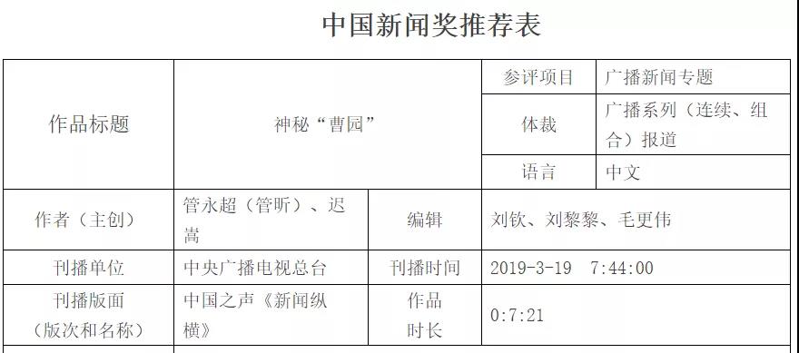 在第三十届(2019年度)中国新闻奖获奖作品中,获一等奖的《神秘“曹园”》是一件舆论监督报道。新华社播发的第三十届中国新闻奖揭晓的通稿中特别提到了这篇报道。