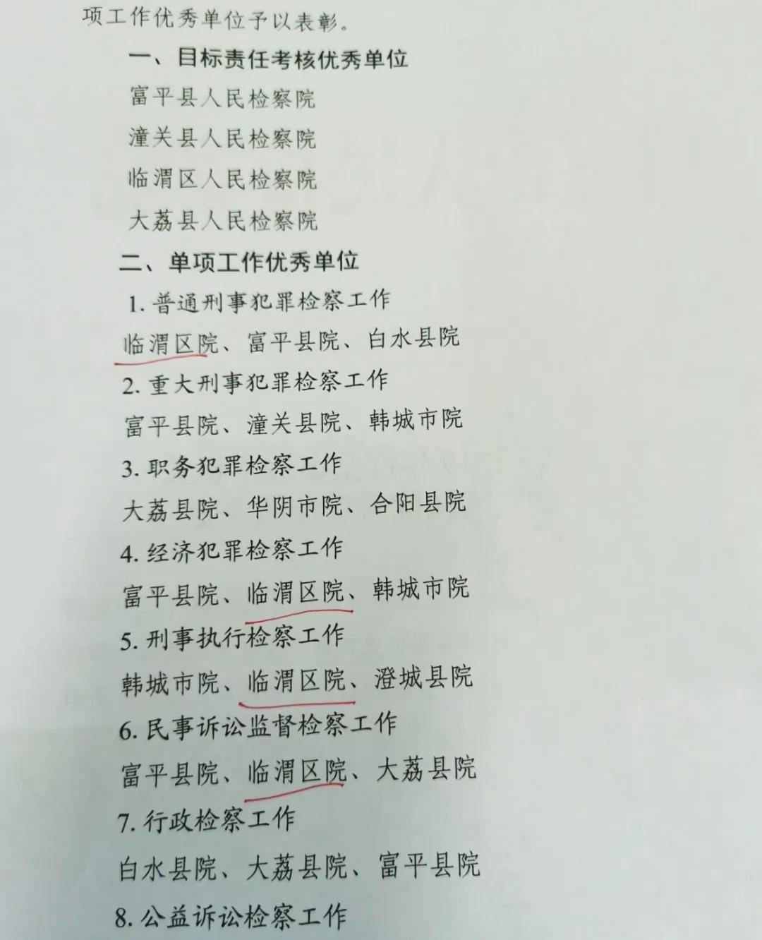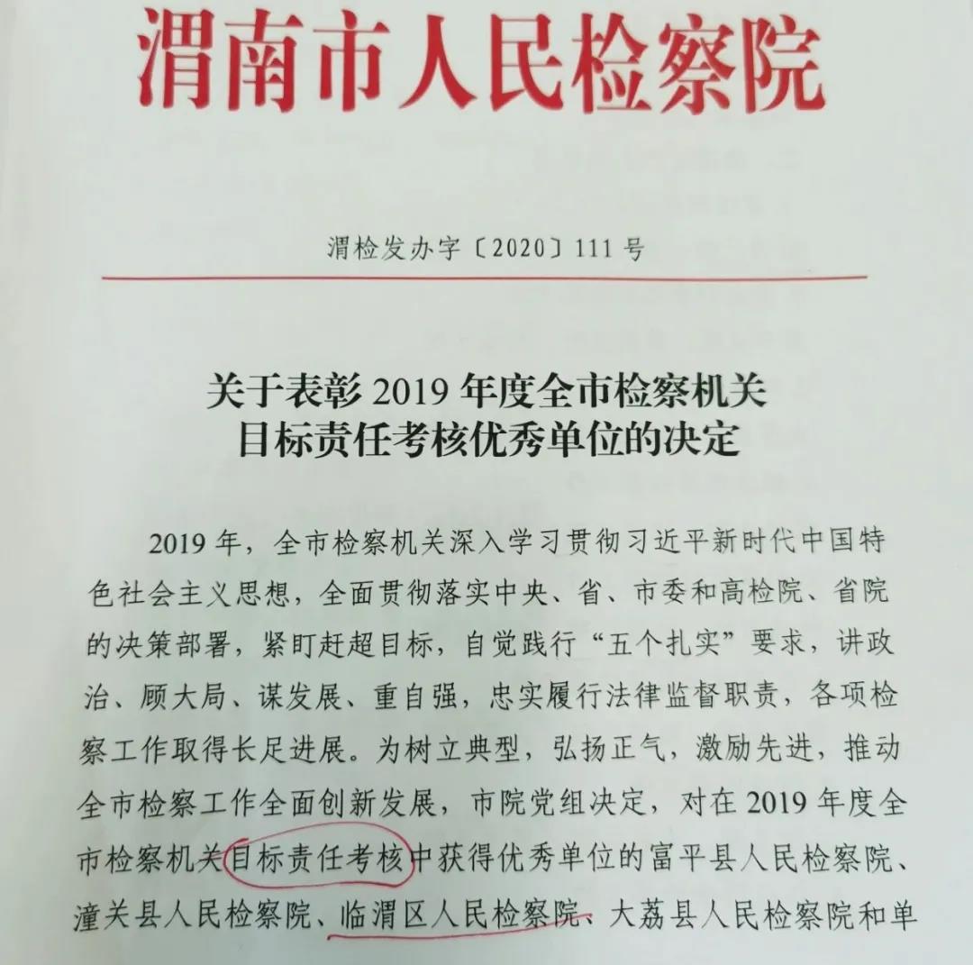 本网讯【吴 瑾】近日,渭南市人民检察院对全市检察院机关2019年度检察工作考核结果进行了通报表彰,临渭区人民检察院荣获“全市检察机关目标责任考核优秀单位”称号,在考核的22个单项工作中普通刑事犯罪检察工作、经济犯罪检察工作、刑事执行检察工作、民事诉讼监督检察工作、控告申诉工作获得“单项工作优秀单位”。