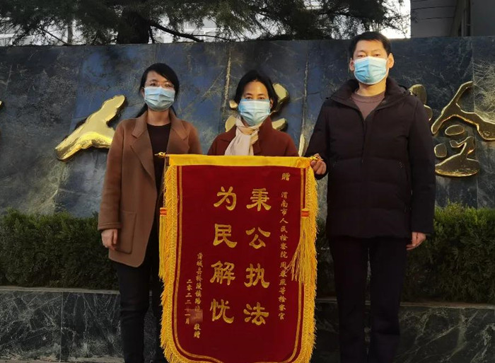 双方见面后,该女士说她是当事人路某的姐姐,由于疫情防控原因,弟弟不能亲自前来当面感谢,千叮咛万嘱咐让在渭南的她一定要把这面“秉公执法为民解忧”的锦旗替他送到检察院,送到检察官手中,感谢检察院为自己主持公道,挽回了25万元。