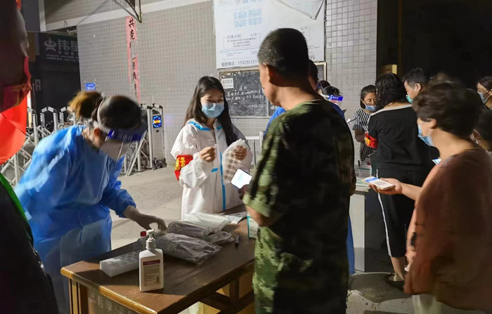 8月23日凌晨03:30,院党组成员、副检察长李建国带领乡村振兴工作队员和部分党员志愿者奔赴许庄镇刘官营村核酸检测点,做好现场消毒、医疗用品分配、配合场面布置等筹备工作,入户走访动员群众佩戴口罩、尽早排队做核酸,全力维护现场秩序,引导群众有序进行核酸检测,耐心地帮助老年人、残疾人等特殊群体录入身份信息,配合做好信息登记等工作,以不怕苦、不怕累、向“疫”冲的精神状态助力刘官营村1600余名村民高效完成核酸检测工作。