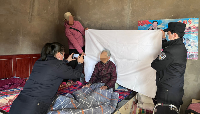 11月17日,路井派出所民警走访入户过程中得知,辖区赵女士常年卧床不起,生活无法自理,现身份证丢失,需从新办理。了解情况后,民警联系户籍员携带相机、背景布等身份证办理工具,上门为辖区行动不便的赵女士办理证件。户籍员来到赵女士家中,细心为赵女士整理好衣服和头发、并将赵女士从床上扶到光线明亮的位置进行拍照。拍照结束后赵女士一家人对民警们表示感谢。