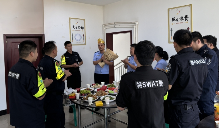 中秋节假日当天,合阳县公安局巡特警大队民警赵博迎来了自己的生日,忙碌的工作使他的生日只能在值班备勤中度过。中午,大队值班人员为他送上了生日祝福,并准备了精美的生日蛋糕以及一碗热腾腾的长寿面。大家一边品尝美食、吃月饼,一边谈笑风生,现场氛围轻松愉悦又热闹温馨,同样的歌声在警营里唱出不一样的味道和温度,蛋糕也因分享变得更加香甜,使这份“双重节日”的喜庆温暖倍增。