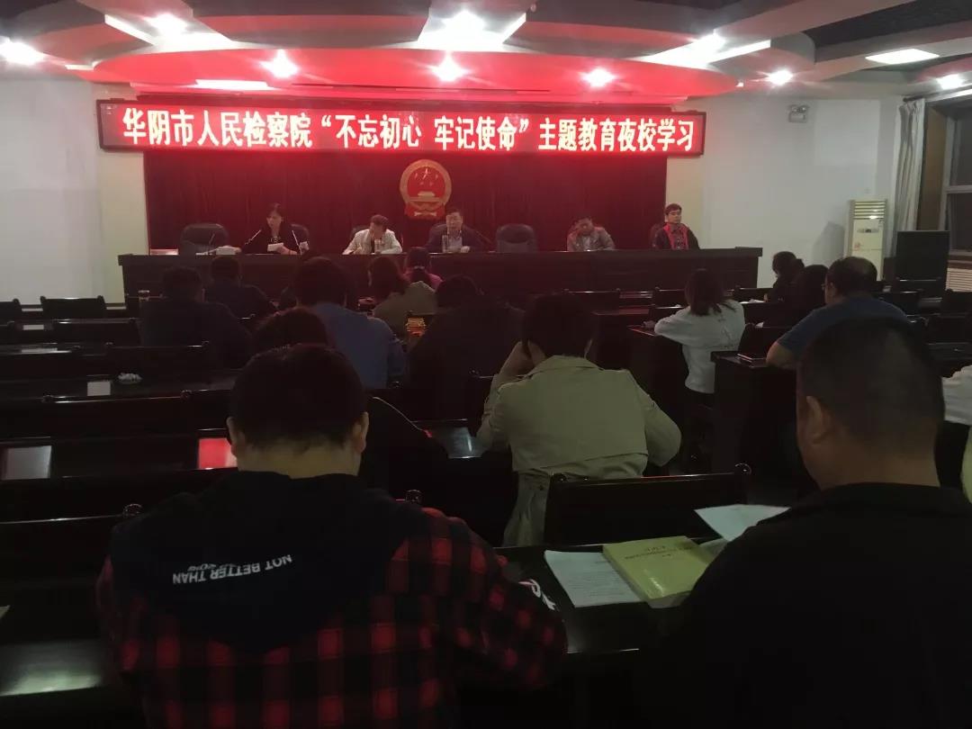 本网讯 (史文聪) 为深入贯彻落实党的十九大精神和习近平总书记在“不忘初心、牢记使命”主题教育工作会议上的重要讲话精神,按照《中共中央关于在全党开展“不忘初心、牢记使命”主题教育的意见》和《中共华阴市委关于开展“不忘初心、牢记使命”主题教育的实施方案》,9月18日晚,华阴市人民检察院召开“不忘初心、牢记使命”主题教育夜校学习。