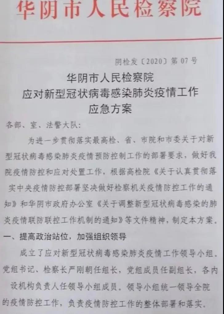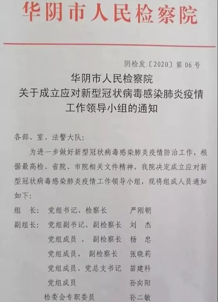 本网讯 (史文聪 杨 婷) 针对近期发生的新型冠状病毒感染肺炎疫情,华阴市人民检察院按照华阴市委和上级检察院要求,高度重视,迅速行动,采取多项措施,全力做好疫情防控工作。