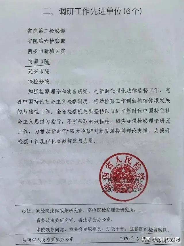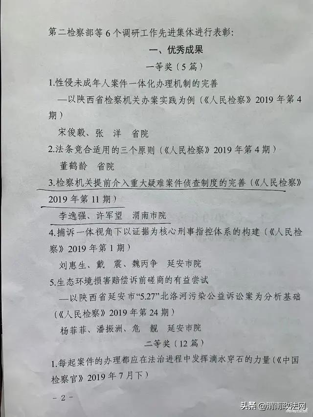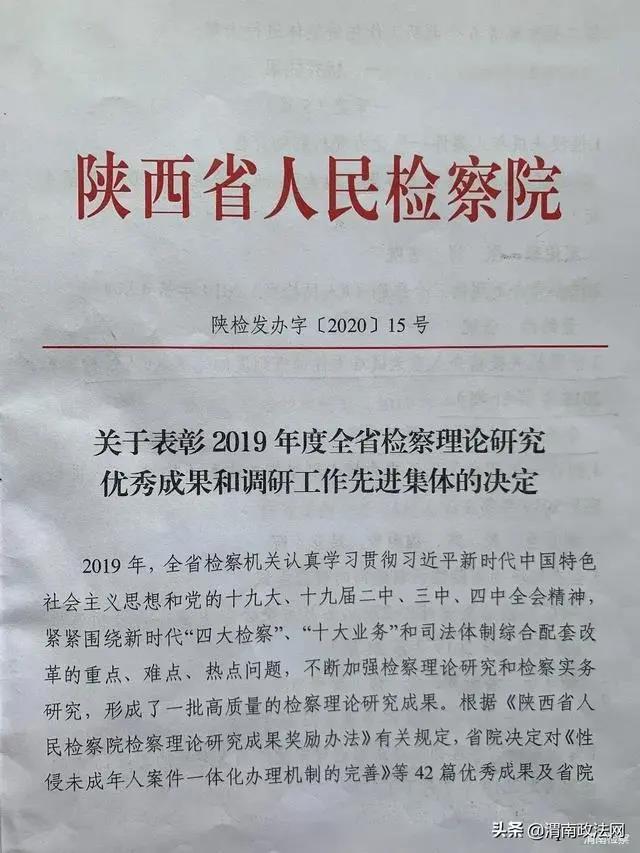 本网讯 近日,渭南市人民检察院被陕西省人民检察院评选表彰为“2019年度全省调研工作先进集体”。这是继获评“2019年度全省政法系统调研信息工作先进集体”后又一次获得殊荣。渭南市检察院两篇调研论文荣获全省检察理论研究优秀成果,其中渭南市检察院党组书记、检察长李逸强撰写的《检察机关提前介入重大疑难案件侦查制度的完善》调研论文被评为“2019年度全省检察理论研究优秀成果一等奖”。