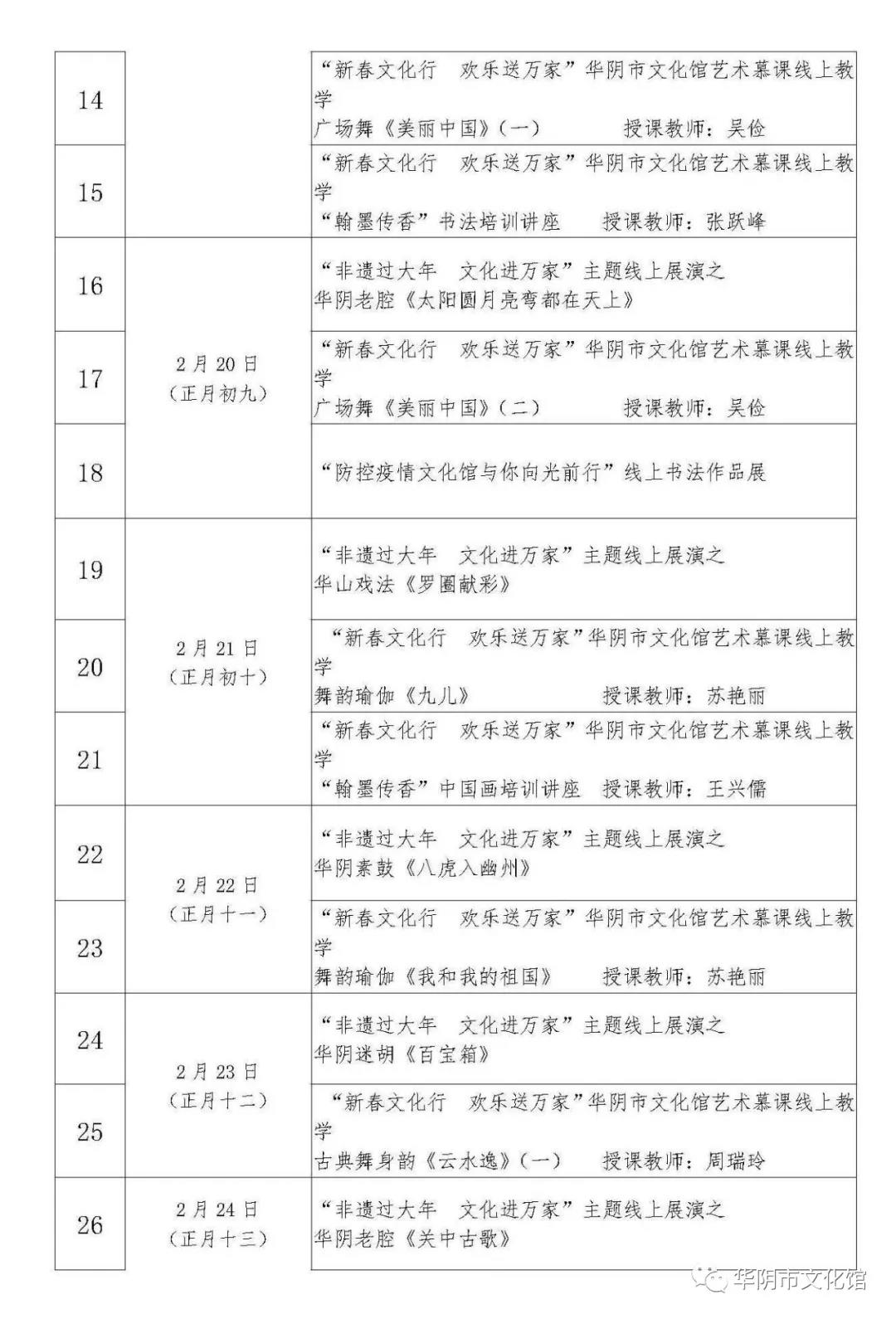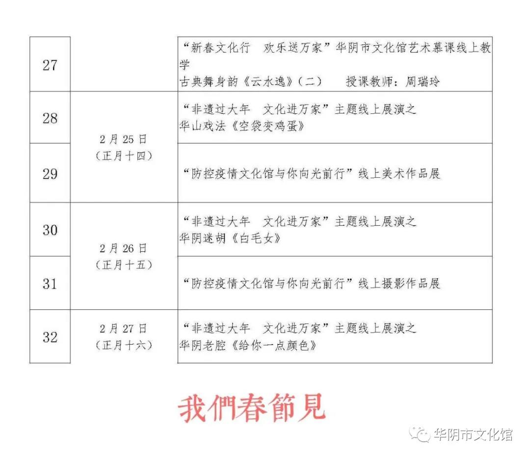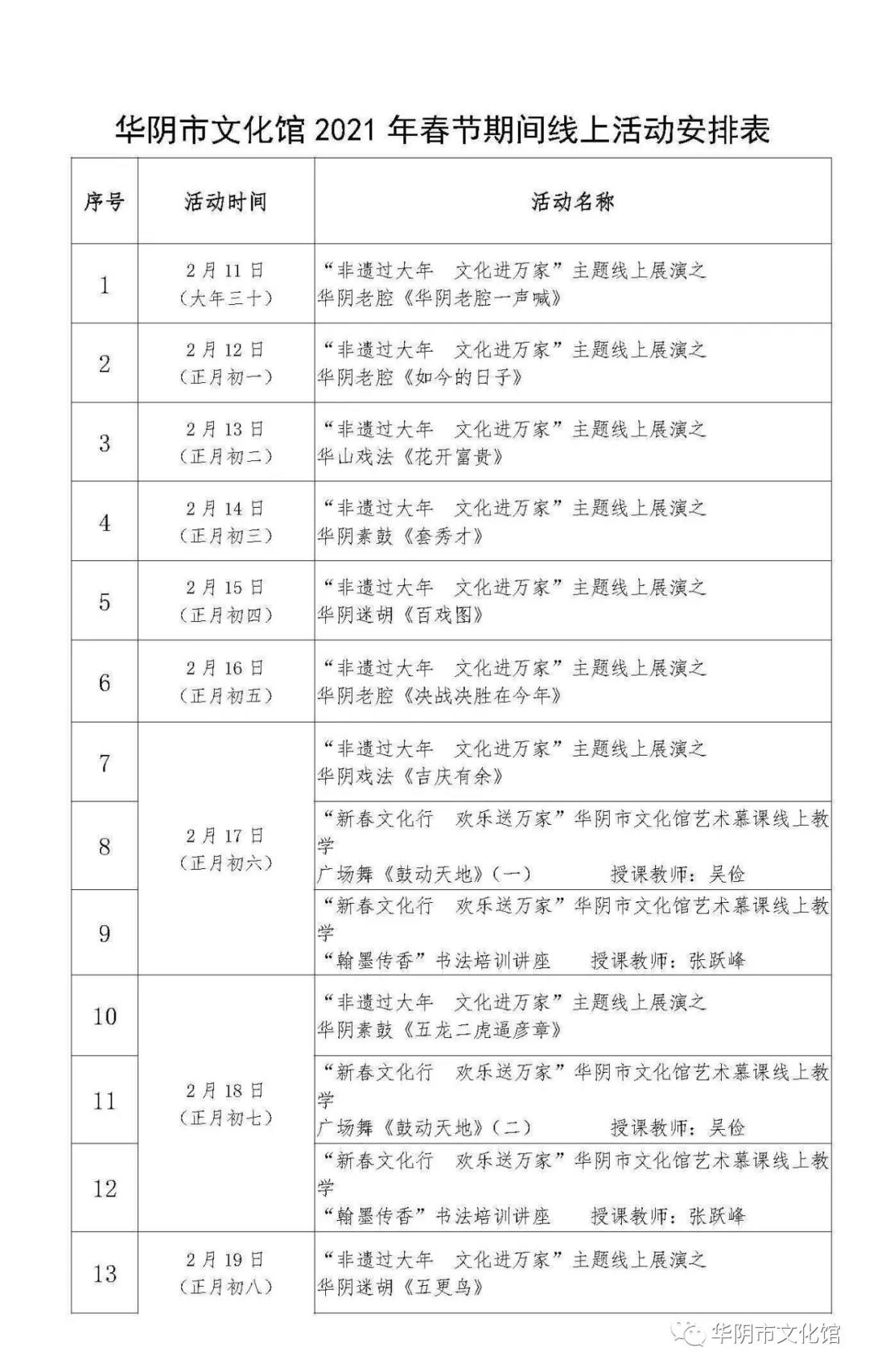 2021年春节降至,为丰富广大群众春节期间文化生活,营造平安有序、温暖祥和的节日氛围,华阴市文化馆在做好疫情防控的同时,结合目前疫情防控形势,在春节期间开展“非遗过大年 文化进万家 ” 、“新春文化行 欢乐进万家”艺术慕课、“防控疫情文化馆与你向光前行”书画摄影展,三大模块共32项活动组成了新年线上系列文化活动,活动当天上午9点将准时与您在华阴文化、文化馆公众号等多个媒体平台相约。现将各项线上活动具体时间安排予以公布,敬请关注!