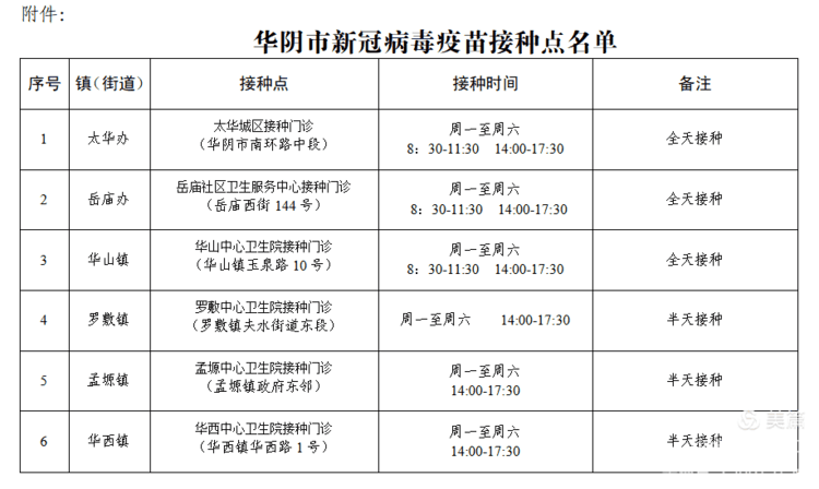 从即日起,我市将新冠病毒疫苗接种由重点人群扩大至一般人群。目前,全市已启用新冠病毒疫苗接种点6个(太华社区卫生服务中心城区接种门诊、岳庙社区卫生服务中心接种门诊、华山中心卫生院接种门诊、罗敷中心卫生院接种门诊、华西中心卫生院接种门诊、孟塬中心卫生院接种门诊)。